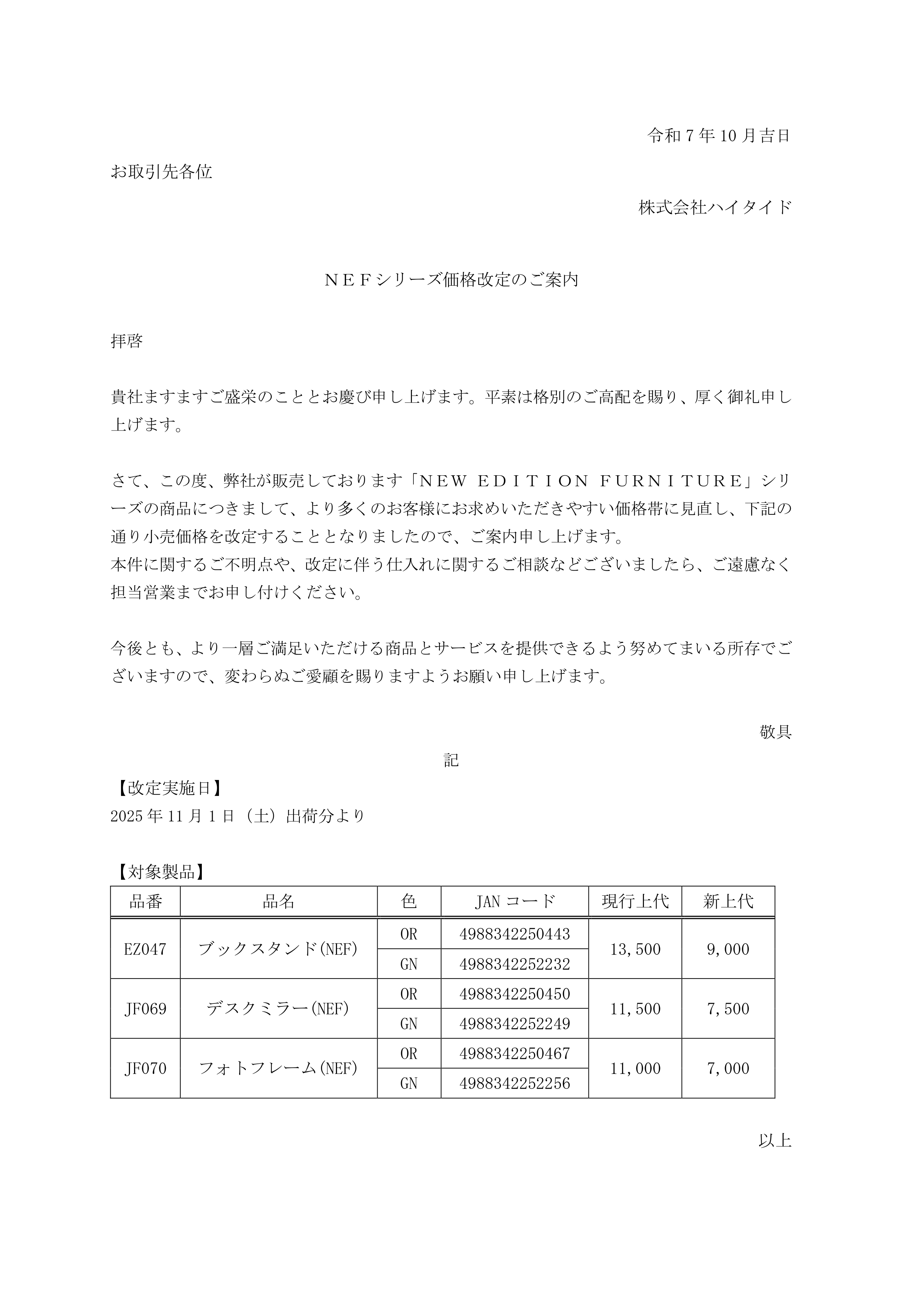 重要 製品価格改定のご案内(2025年11月1日実施分)