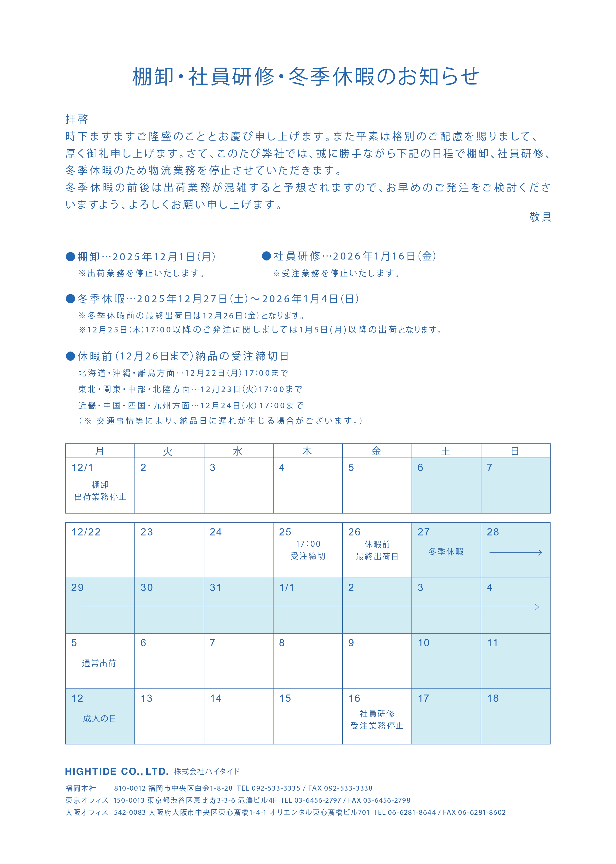 お知らせ 棚卸・社員研修・冬季休暇のお知らせ