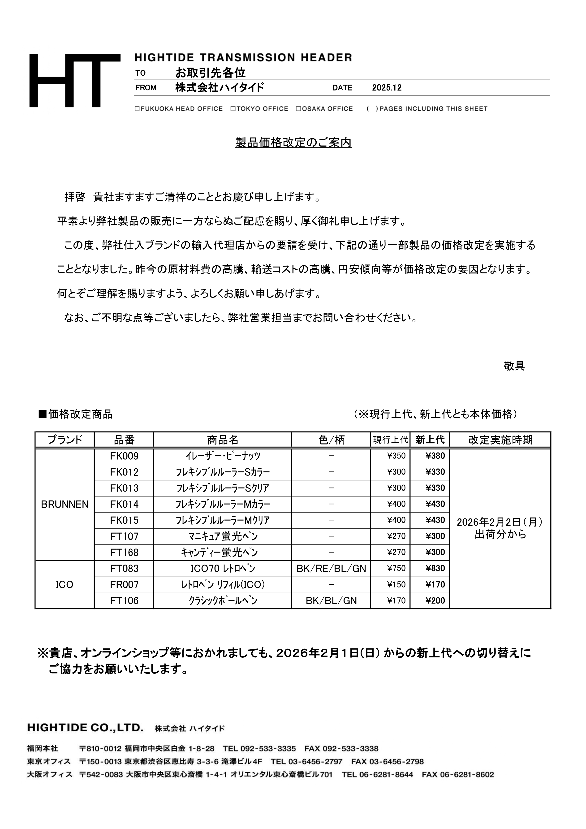 重要 製品価格改定のご案内(2026年2月1日実施分)