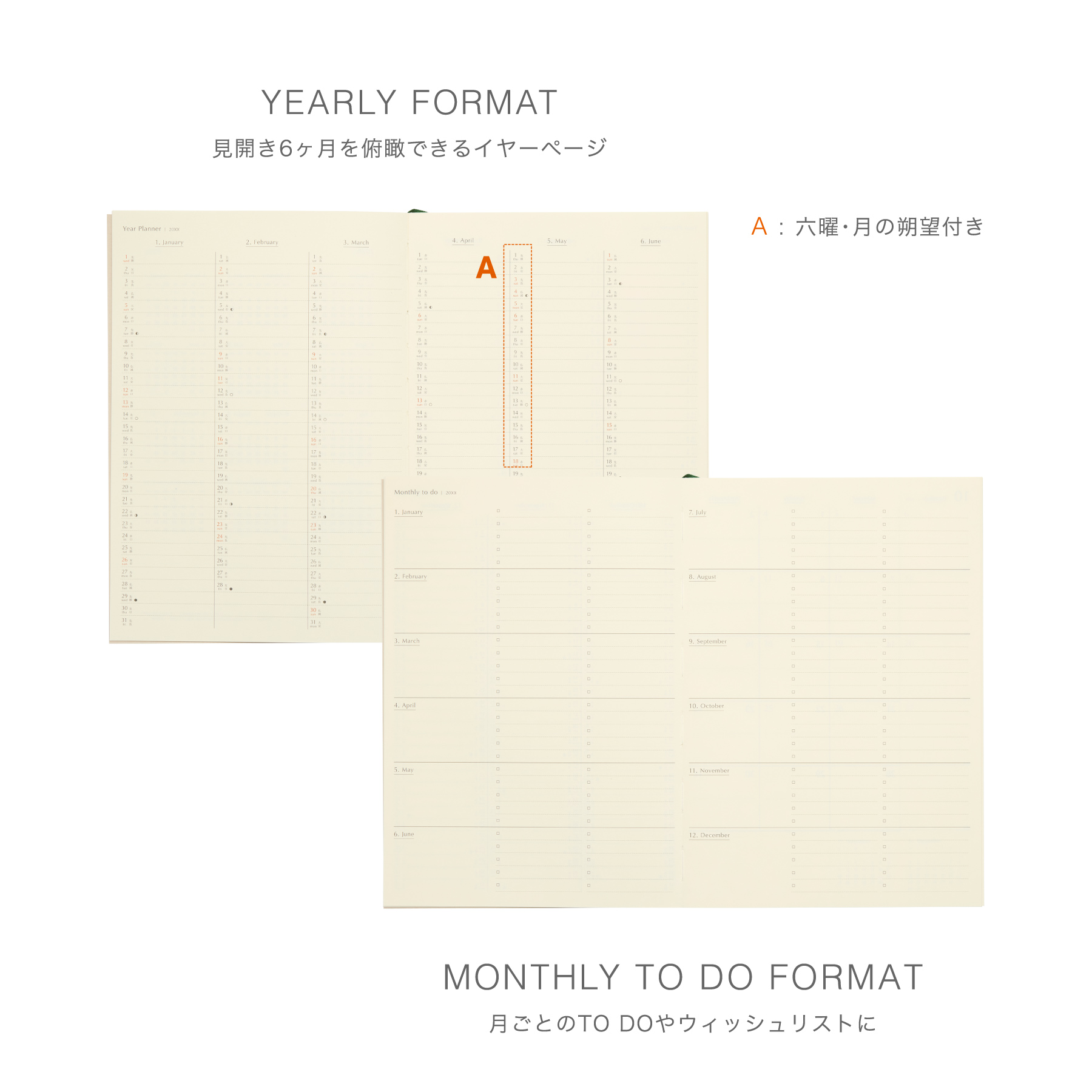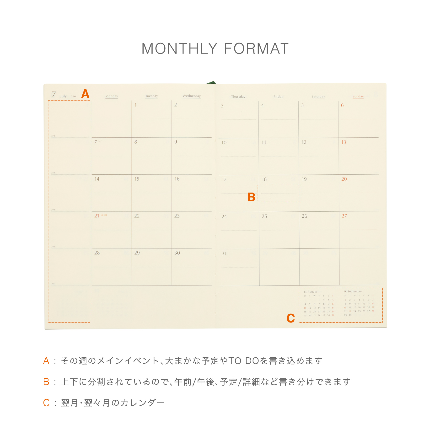 | 内容 | 80ページ(カレンダー、年間スケジュール、マンスリー TO DO、月間スケジュール、ノート、パーソナルデータ) |