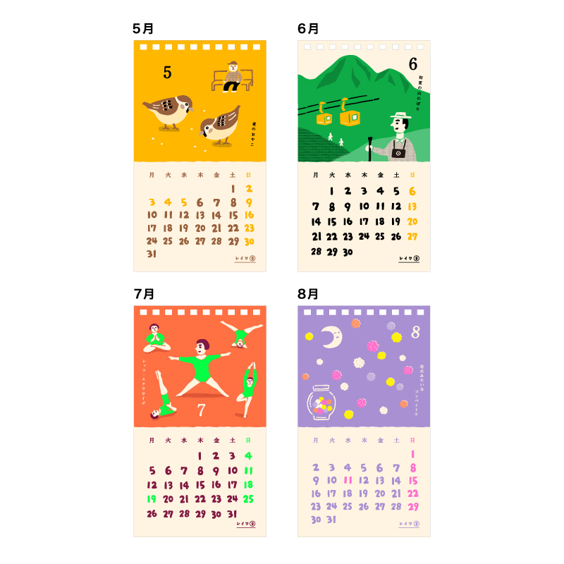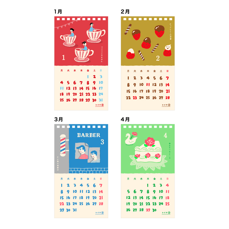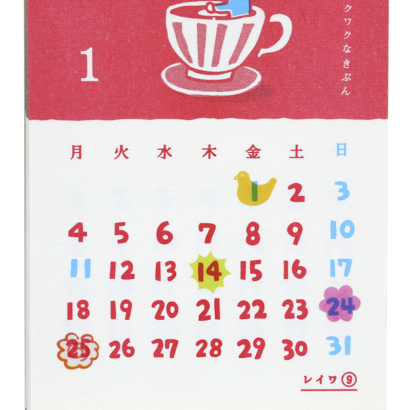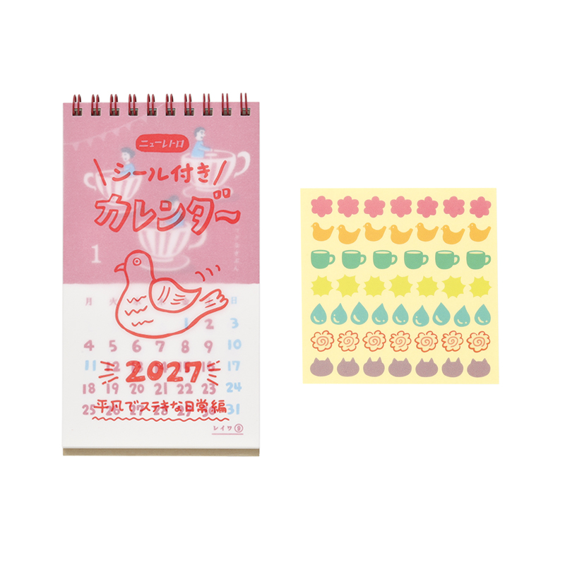 1枚ずつ手刷りしたような、リソグラフ印刷の優しい風合いが魅力の卓上カレンダー。明るいカラーとノスタルジックなグラフィックで「平凡でステキな日常」を表現しました。日付の上に貼れる透明シール付きです。