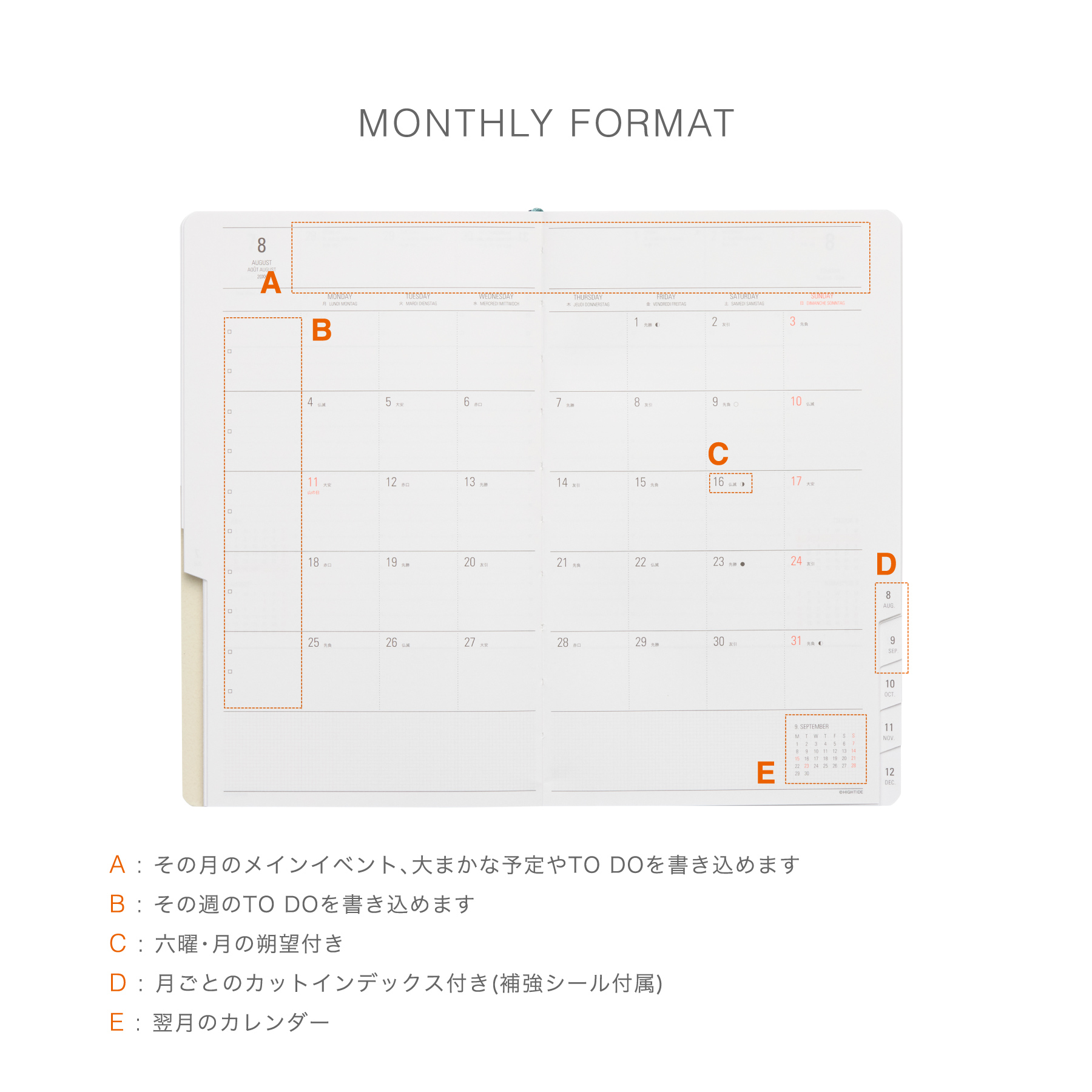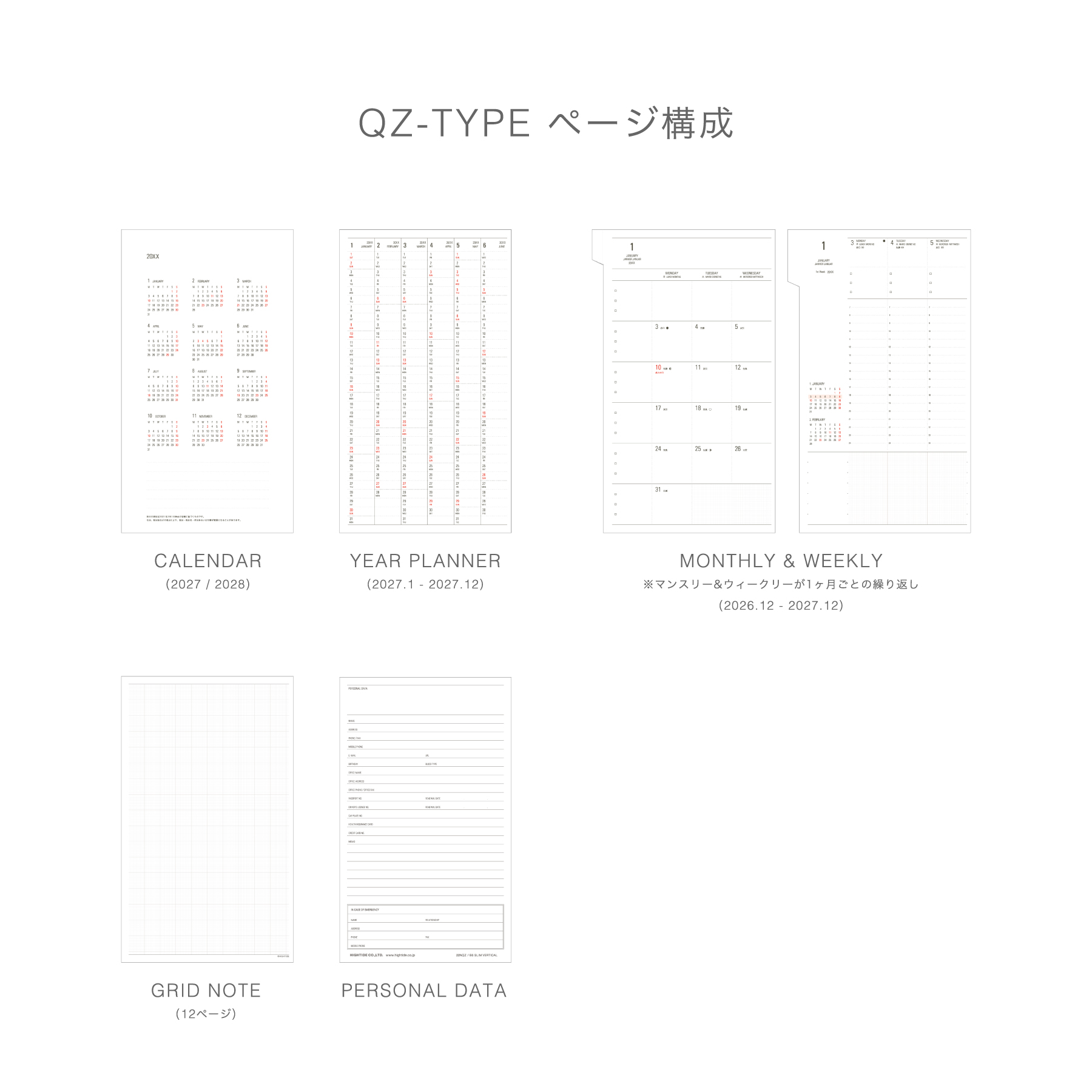 | 内容 | 176ページ(カレンダー、年間スケジュール、月間スケジュール、週間スケジュール、ノート、パーソナルデータ、月間インデックス) |