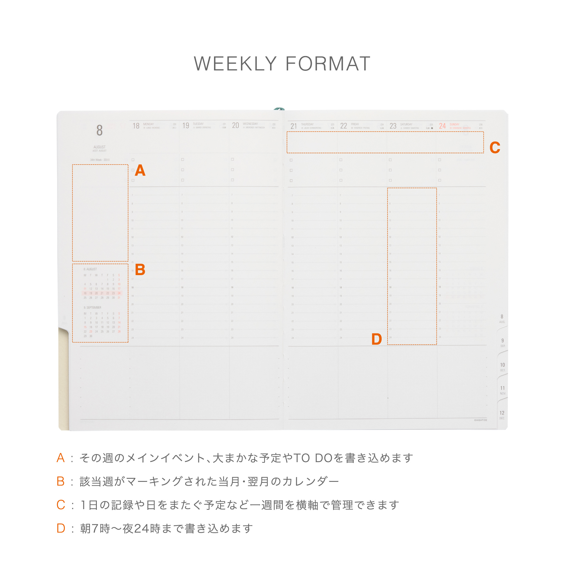 | 内容 | 192ページ(カレンダー、年間スケジュール、月間スケジュール、週間スケジュール、ノート、パーソナルデータ、月間インデックス) |