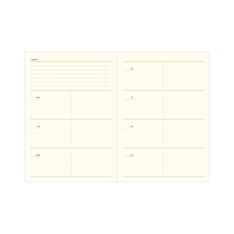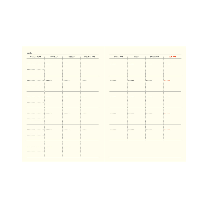 紙クロス表紙に箔押しが効いたA6サイズのフリーダイアリー。マンスリー(15ヶ月分)+ウィークリー(66週分)で構成された全176ページ。コンパクトで持ち運びしやすい文庫本サイズです。