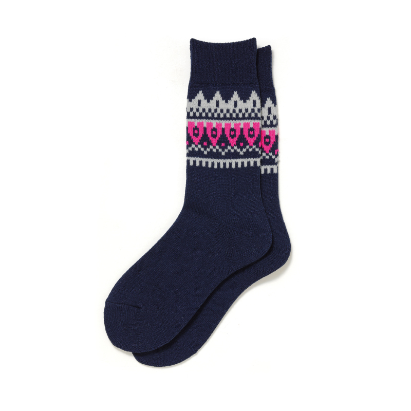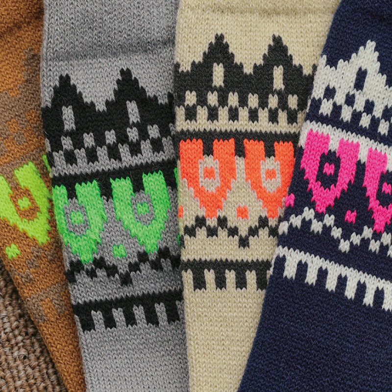 アパレルブランド「FUJITO」ディレクションによる、フェアアイル柄をローゲージで再現したソックス。一部に使用したネオンの糸がアクセント。暖かく柔らかい質感のアクリル製の糸を使用。