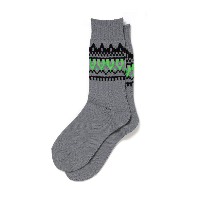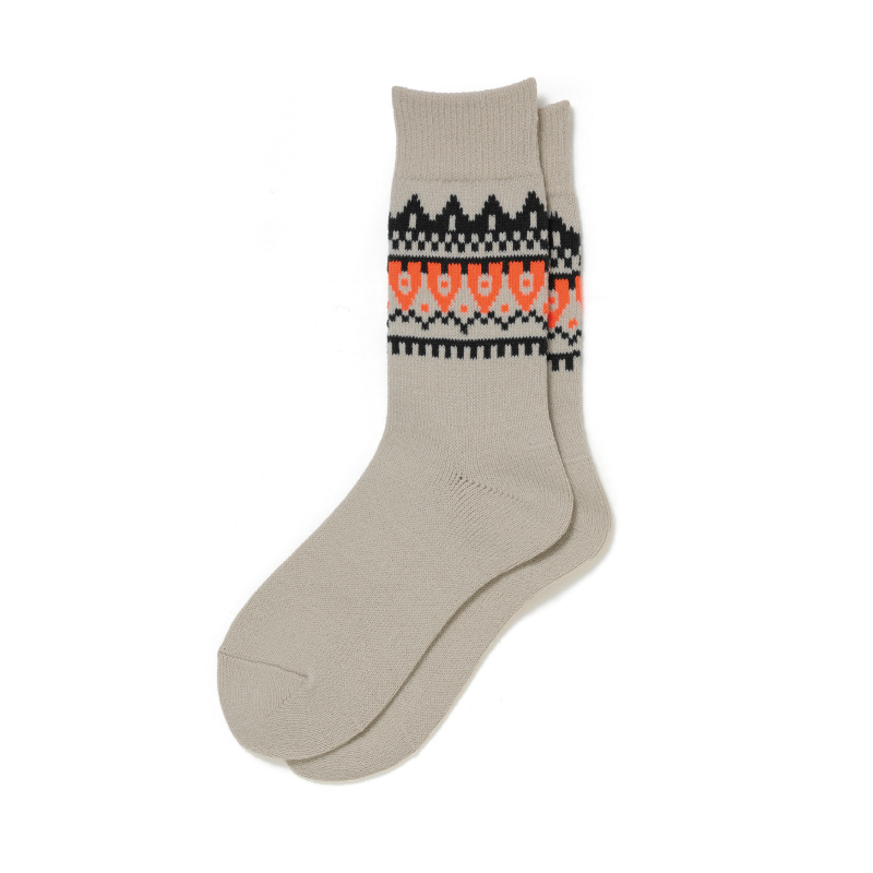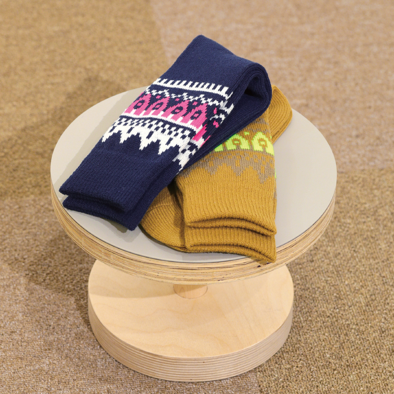 アパレルブランド「FUJITO」ディレクションによる、フェアアイル柄をローゲージで再現したソックス。一部に使用したネオンの糸がアクセント。暖かく柔らかい質感のアクリル製の糸を使用。